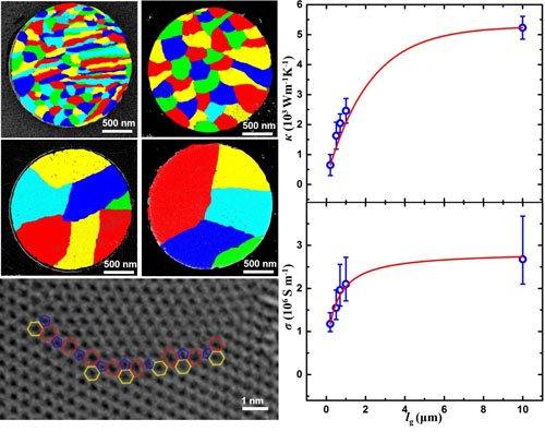 最近,沈阳材料科学国家(联合)实验室先进炭材料研究部石墨烯研究组采用溶碳量适中的金属铂片作为生长基体,发展出一种基于“析出-表面吸附生长”原理的CVD方法,仅通过改变析出温度便实现了对石墨烯形核密度的控制,制备出晶粒尺寸在~200 纳米到~1 微米范围内均一可调、且晶界完美拼合的高质量单层多晶石墨烯薄膜。在此基础上,获得了晶粒尺寸对多晶石墨烯的电导率和热导率的影响规律及晶界电阻率(~0.3 kW·µm)和晶界热导(~3.8×109 Wm-2K-1),发现减小晶粒尺寸可导致热导率的显著降低但对电导率的影响较小。根据该影响规律推算,当石墨烯的晶粒尺寸从1毫米减小到5纳米时,其热导率的衰减幅度可达300倍,而电导率的衰减仅为10倍左右,并且热导率和电导率随晶粒尺寸变化的变化率高于典型的半导体热电材料。