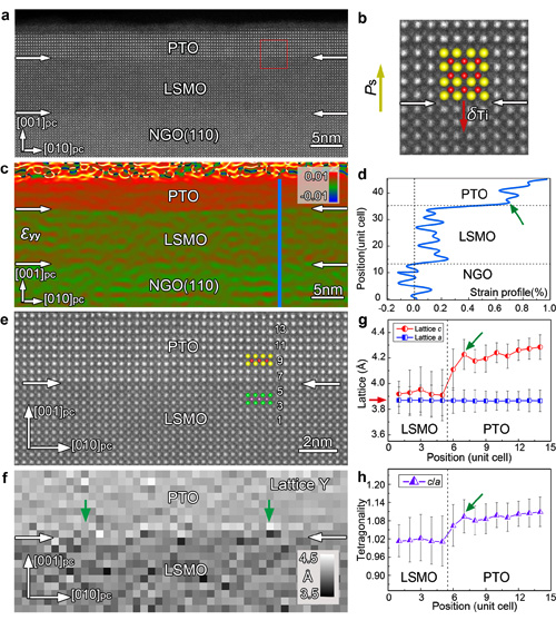 图1、3.6nm PbTiO3/La0.7Sr0.3MnO 3 薄膜界面处的晶格参数和应变分析。显示出PbTiO3/La0.7Sr0.3MnO3薄膜界面处面外晶格常数(g)以及四方性(h)显著增加。