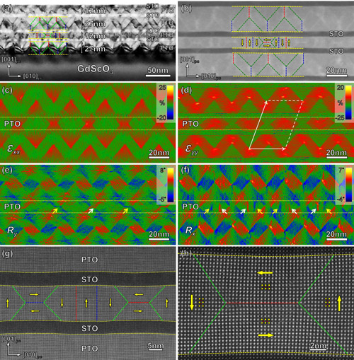 图2、相邻PTO层的厚度比为0.5的PTO/STO多层薄膜的像差校正透射电子显微分析。较厚的PTO层中出现周期性V畴阵列,而较薄的PTO层中则出现规则排列的H畴阵列。(a)PTO/STO多层膜的TEM明场像。(b)薄膜的HAADF-STEM像。(c,d)对图(b)进行几何相位分析得到的面内和面外晶格应变二维分布图。(e,f)对应于图(b)的面外和面内晶格旋转二维分布图。(g,h)薄的PTO层放大的HAADF-STEM像。