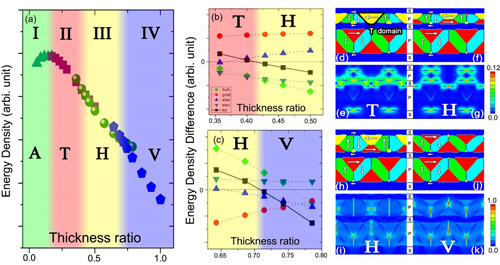 图5、多层PTO/STO薄膜体系的相场模拟。(a)随相邻PTO层中的厚度比变化,PTO中畴结构的相图。其中包含四个畴区域I,II,III,IV分别对应a1/a2畴(A),梯形a畴(T),水平全闭合畴结构(H)以及竖直全闭合畴结构(V)。(b)第二个转变点附近H畴和T畴之间的能量密度差。(c)第三个转变点附近V畴和H畴之间的能量密度差。T畴(d,e)和H畴(f,g)的畴组态及其弹性能量密度分布图。H畴(h,i)和V畴(j,k)的畴组态及其弹性能量密度分布图。