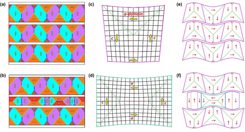图4、V畴和H畴阵列的示意图(a-b)和向错应变分析(c-f)。(c)竖直和(d)水平全闭合畴结构中晶格应变示意图。(e)相邻PTO层厚度相同时,周期性竖直全闭合有利于容纳其中的应变。(f)相邻PTO层厚度比为1/2时,较薄PTO层中形成水平全闭合有利于容纳其中的应变。