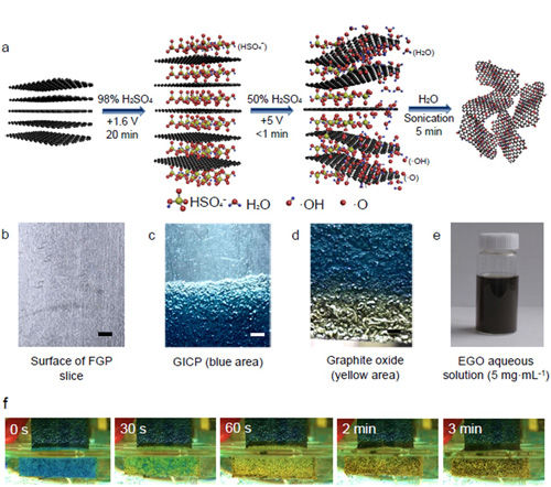 最近,沈阳材料科学国家(联合)实验室先进炭材料研究部提出了一种电解水氧化的新方法,打破了150多年来通过强氧化剂对石墨进行氧化的传统思路,实现了氧化石墨烯的安全、绿色、超快制备。该方法首先在浓硫酸中将石墨插层,然后在稀硫酸中对插层石墨进行氧化。氧同位素示踪和自由基捕获实验表明,氧化石墨烯中的氧元素主要来源于电解液中的水,电解水产生的大量高活性氧自由基与石墨反应生成了氧化石墨烯。反应中硫酸几乎没有损耗,也不生成其它物质,可被重复用于电化学反应。研究还发现,电解水氧化制备氧化石墨烯的氧化速率比现有方法快100倍以上,而所得材料与现有方法类似,并且易于连续化制备。