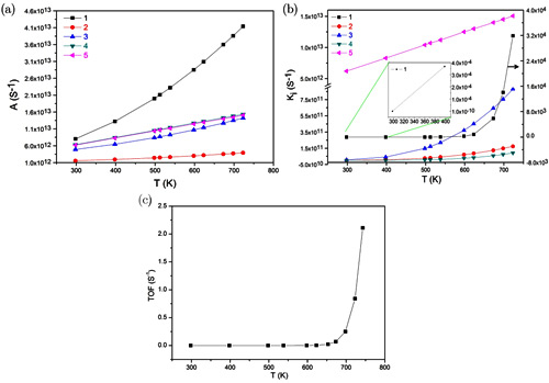 图3.通过微观反应动力学计算得到的乙烷氧化脱氢反应动力学参数。(a)指前因子 (b)反应平衡常数 (c) 反应转化频率