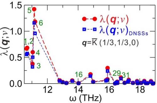 图3 计算揭示了金属铍的(0001)表面来自狄拉克节线诱导的鼓膜拓扑态电子与低频区表面声子耦合导致电声耦合的反常增强。图示非平庸表面态电子与低频区K点表面声子的耦合显著贡献了反常增强现象。