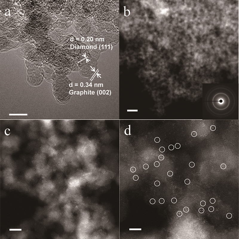 图1催化剂球差电镜表征。(Cu主要以单个原子形式分散在在体表面,见图d,以白色圆圈标注。)