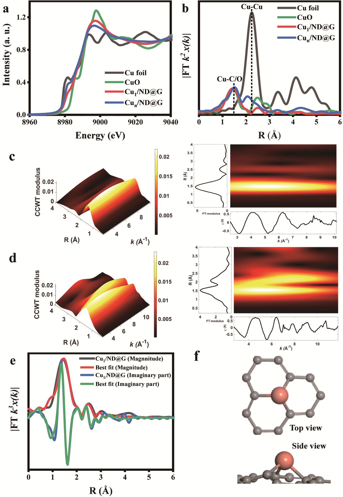 图2催化剂XAFS表征。(XANES光谱表明Cu带部分正电荷,EXAFS表明Cu1/ND@G中只存在Cu-C键,Cu以Cu-C3形式稳定在石墨烯载体上。)