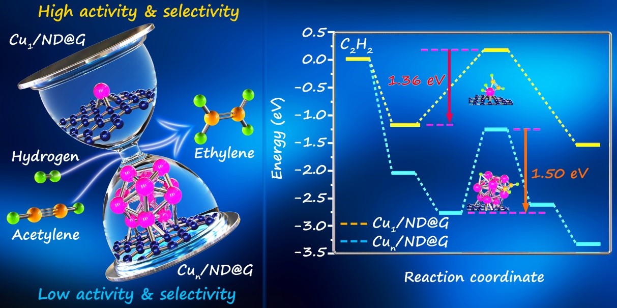 图5催化性能对比示意图。(Cu1/ND@G与Cun/ND@G相比具有更低的乙炔或化能垒(1.36 eV vs 1.50 eV)。)