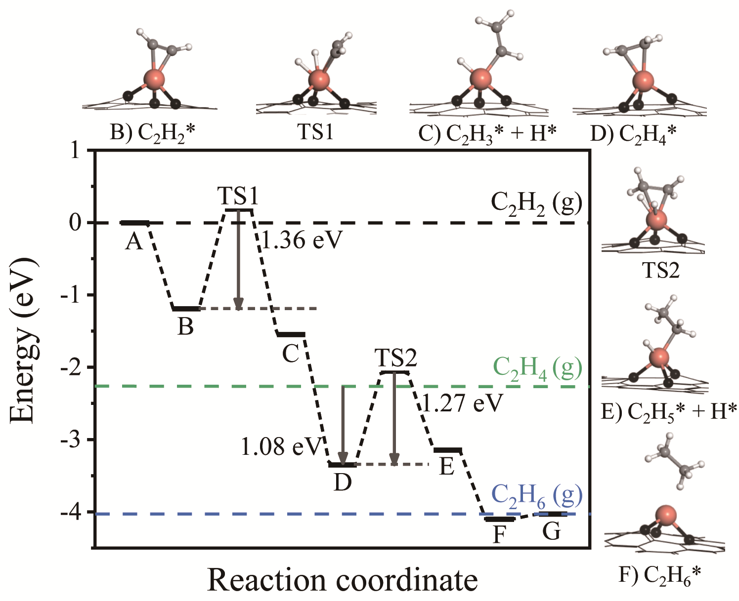 图4 DFT计算。(反应中间产物乙烯脱附能垒(1.08 eV)小于乙烯进一步加氢能垒(1.27 eV),有利于乙烯脱附而避免乙烯进一步过度加氢。)