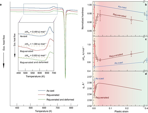 图2变形过程中块体非晶合金的能量状态和结构的变化。(a)回春态非晶合金在变形前后的DSC曲线和驰豫焓;铸态和回春态非晶合金的(b)归一化硬度,(c)驰豫焓,以及(d)主衍射环位置q1与塑性变形量间的关系。回春态非晶合金在最初变形阶段(<5%)表现出显著的加工硬化,伴随着硬度升高和能量的降低,以及结构的有序化。这完全不同于传统铸态非晶合金应变软化并伴随能量增加过程。