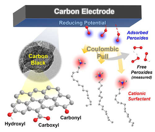 图1,碳/表面活性剂体系催化氧还原反应高选择性生成过氧化氢的促进作用示意图。