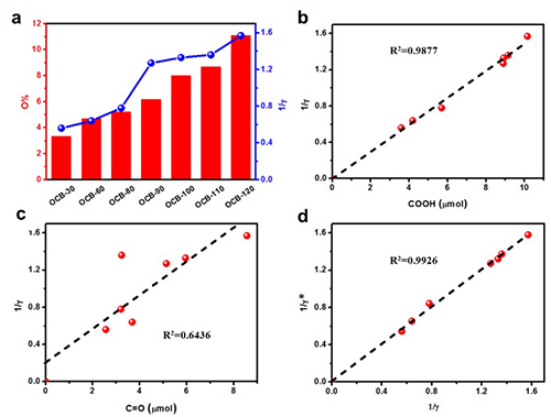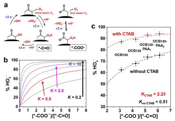 图2,氧还原反应二电子选择性与碳材料表面含氧官能团(-COOH, C=O)数量之间的关系:动力学拟合和实验结果的对比。