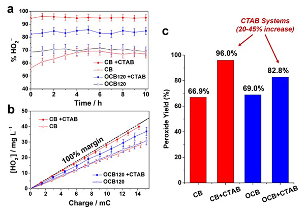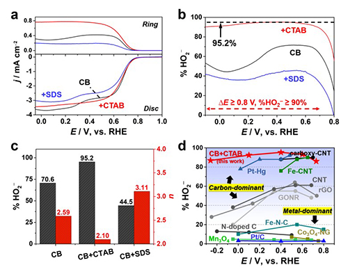 基于上述反应过程和机理分析结论,能源催化材料课题组齐伟博士与北京大学郭少军教授和福州大学谢在来课题组开展合作,成功实现利用界面工程手段和反应动力学思想来调控碳催化电化学氧还原反应选择性的创新研究思路。具体作法是利用阳离子表面活性剂(如:三甲基十六烷基溴化铵)与羧基基团的静电相互作用降低碳材料表面羧基官能团与二电子氧还原产物HO2-的相互作用,阻止其被进一步还原,成功实现了高选择性电合成H2O2的过程。这种碳/表面活性剂复合催化材料体系展现出目前已知报道最高的H2O2选择性(>96%)、最宽的过电位窗口(>0.8 V)和可观的稳定性(>10h)。鉴于纳米碳/表面活性剂复合电极材料在过氧化氢电合成反应中的优异催化表现,整个反应体系能耗低、绿色、可持续、稳定性好的特点,尤其是对该体系结构-功能关系的深刻理解,这项研究工作对未来设计开发具有实际应用前景的高产率、高稳定性和低成本的电合成过氧化氢化合物体系具有重要的指导意义。