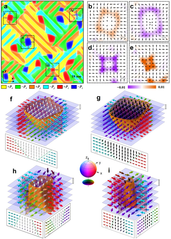 图4:随机半子模型的相场模拟结果。(a)水平截面图;(b-e)图a中四个区域的极化矢量和拓扑密度分布图;(f-i)这四个拓扑畴结构的三维极化矢量图。