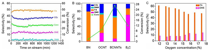 图2. BCN纳米管复合材料在甲醇转化反应中的催化活性、目标产物选择性和稳定性。
