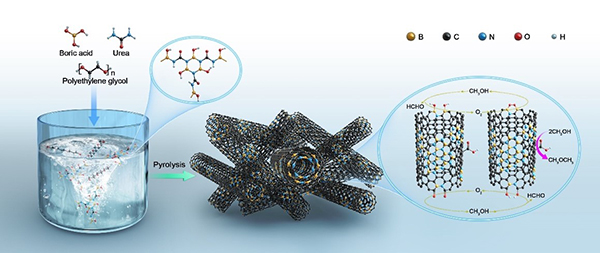 图1. BCN纳米管复合材料的制备过程及其催化甲醇转化路径。