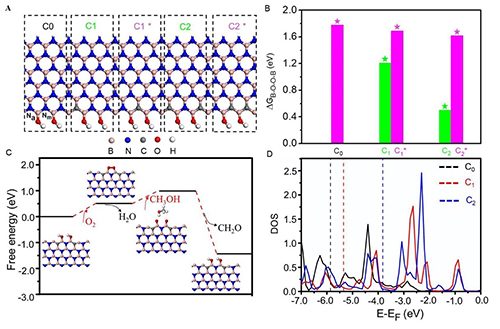 图5.理论计算分析BCNNTs催化甲醇转化反应路径和活性中心。