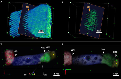 图1 双晶及多晶金属的原子分辨率电子层析三维重构。