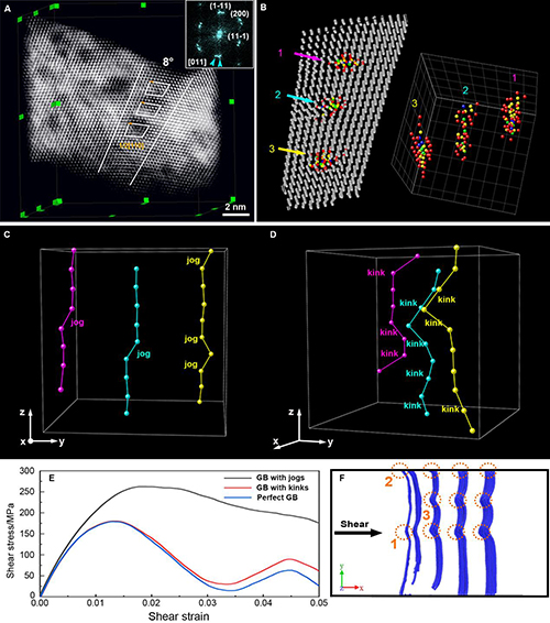 图3 小角晶界(位错型晶界)的三维原子结构、晶界位错的扭折和割阶组态及行为。