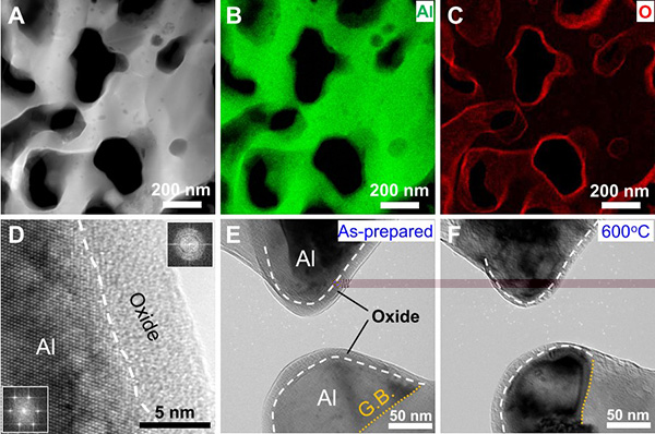 图1 纳米多孔铝的结构表征。(A-C)纳米多孔铝孔棱的HAADF-STEM图像和EDS元素分布图;(D)纳米多孔铝孔棱的HRTEM图像;(E,F)氧化铝层在600°C下退火 0.5 h前后的准原位TEM 图像。