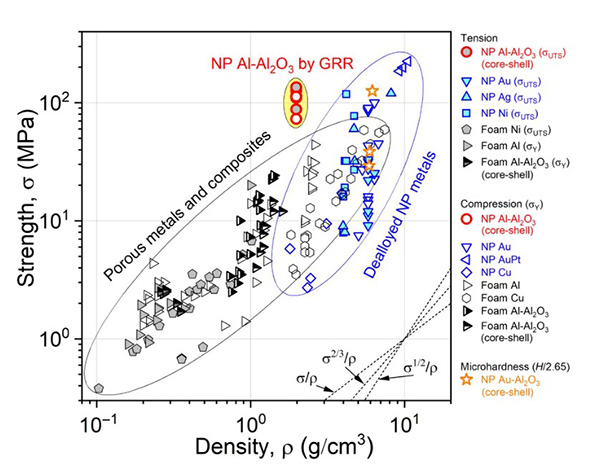 该团队将脱合金腐蚀与置换反应(GRR)相结合,成功制备出无裂纹的高质量纳米多孔铝样品。其孔棱直径约为200 纳米,且孔棱表面覆盖有自发生成且可自修复的氧化铝纳米壳层(图1)。该纳米氧化膜不仅阻止材料进一步氧化和自燃,而且大幅降低表面扩散速率,从而提高纳米多孔铝的热稳定性。该材料纳米多孔结构在接近铝熔点温度下仍能保持稳定而不发生显著结构粗化。由于该材料较好的多孔结构联结性和优异的承载效率,以及表面氧化膜的强化作用,纳米多孔铝在拉伸和压缩条件下均表现出高强度。其强度远高于同等密度传统泡沫金属材料。与已报道的纳米多孔金属相比,纳米多孔铝不仅更稳定,而且密度更低,比强度更高(图2)。该研究不仅为发展新型轻质高强度新材料提供新思路,也为探索高温等极限条件下纳米多孔金属功能应用提供契机。