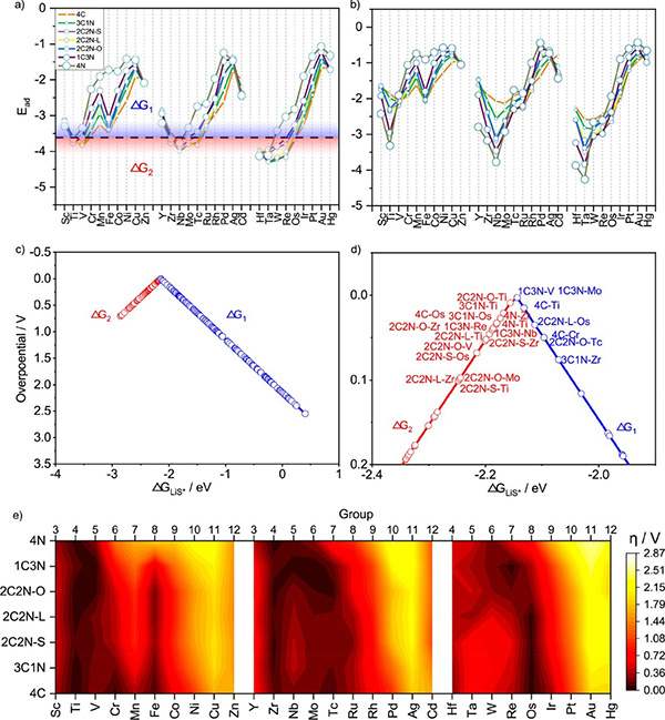 图三、多硫化锂吸附能及过电势的预测。a) LiS*的吸附能,b) 不同催化剂上最弱的可溶性多硫化锂吸附能,c)所预测的全部催化剂的“火山图”,d) 过电势低于0.1V的催化剂,e) 预测的过电势。