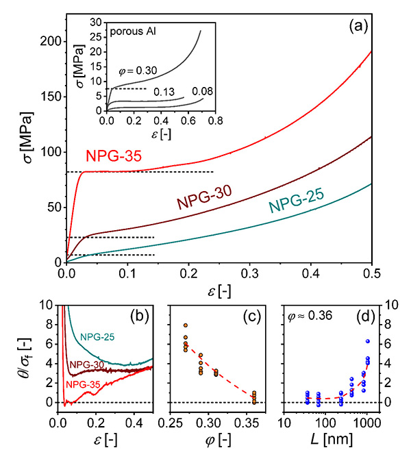 图1. 纳米多孔金的压缩变形行为。(a) 不同相对密度纳米多孔金的压缩应力应变曲线。小图为不同相对密度常规多孔铝的压缩应力应变曲线。(b) 不同相对密度纳米多孔金归一化后的加工硬化率随压缩应变的变化情况。(c) 纳米多孔金归一化加工硬化率随相对密度的变化。(d) 相对密度为0.36的NPG-35样品的加工硬化率随孔棱尺寸的变化情况。