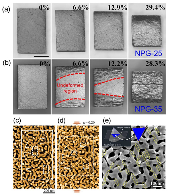 图2. 纳米多孔金的均匀与非均匀变形。相对密度为0.27的NPG-25样品 (a) 和相对密度为0.36的NPG-35样品 (b) 压缩不同应变后的表面形貌光镜照片。(c-d) 为NPG-25样品压缩20%前后局部变形情况。可见孔棱发生弯曲变形和悬挂孔棱发生搭接。(e) 压缩10%的NPG-35中,变形带内的孔棱发生位错雪崩式滑移变形的痕迹。