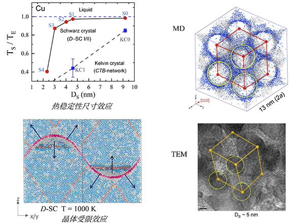 调整Kelvin多晶晶粒大小,发现从Kelvin多晶到Schwarz-D晶体的转变温度随晶粒尺寸降低而下降,得到的Schwarz-D晶体极小面孔径也更小。如图2所示,受限晶体极小面孔径从9 纳米到3纳米,失稳温度仅从0.98 TE 降低到0.87 TE (TE,晶体热力学平衡热点)。孔径为3纳米的受限晶体晶胞仅包含了3,000多个原子,但仍能展示出超高的热稳定性。
