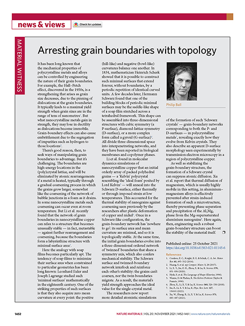 近日,《Nature Materials》News & Views专栏在线发表了著名科学与科普作家、《Nature》杂志顾问编辑Philip Ball的专题文章《Arresting grain boundaries with topology》(利用拓扑结构锁定晶界),介绍了纳米金属材料团队在受限晶体结构方面的重要发现。受限晶体结构(Schwarz crystal)是晶界面受三维有序孪晶网络全方位约束,空间连续贯通并呈现周期性规则排列的极小曲面晶体。文章提到早在十八世纪Leonhard Euler和Joseph Lagrange就对极小面进行了数学研究,而在十九世纪德国数学家Hermann Schwarz发现周期性极小曲面可能组装成具有立方对称性(P-surface)、金刚石对称性(D-surface)或更为复杂的G-surface的三维结构。并进一步介绍纳米金属材料研究团队的研究表明一旦形成Schwarz结构,因为具有最小表面积和平均曲率,晶界网络就“无处可去”,因此在拓扑上是最稳定的;同时三维有序的孪晶界面网络进一步贡献了结构稳定性。Schwarz界面和孪晶界网络的互锁增强了彼此的稳定性:晶粒不会粗化,孪晶界不会迁移;也因此,材料屈服强度接近金属理论值。文章进一步介绍了纳米金属材料研究团队在受限晶体(Schwarz crystal)的形成和抑制原子的高温扩散行为、相析出等方面的研究工作。最后,文章再次强调通过设计类似受限晶体结构的超强晶界结构能够提高材料的稳定性。