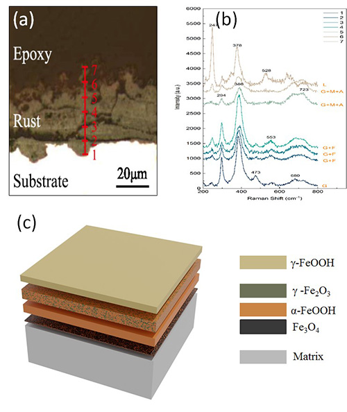 图2. Q235钢在模拟海岸大气环境下60CCT后的锈层截面拉曼光谱及锈层深度方向上的成分结构示意图,(a) 拉曼光谱作用位置,(b) 锈层截面的拉曼光谱,(c)锈层深度方向上的成分结构示意图
