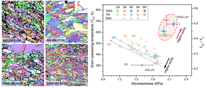 图:左图为2N和6N铜纳米晶(nanograins,NG)和弛豫态纳米晶(relaxed nanograins,RNG)在典型温度退火后的晶粒图片对比;右图为本工作和文献中不同纯度铜样品热稳定性(晶粒粗化温度)和显微硬度分布关系图。