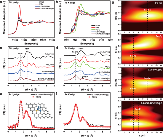 图2. 全暴露PtFe双金属团簇(0.75Pt0.2Fe/ND@G)的XAFS表征