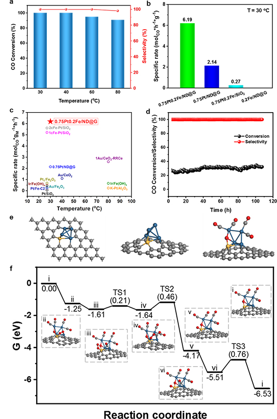图3. 全暴露PtFe双金属团簇(0.75Pt0.2Fe/ND@G)的PROX反应催化性能以及理论计算研究