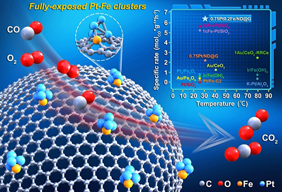 最近,沈阳材料科学国家研究中心刘洪阳研究员和博士研究生贾志民等人与北京大学马丁教授、香港科技大学王宁教授、中科院上海应用物理所姜政研究员以及中科院山西煤化所温晓东研究员等团队合作,设计出一种锚定在弯曲石墨烯载体(ND@G)上的新型PtFe双金属团簇催化剂(0.75Pt0.2Fe/ND@G),该催化剂由少数几个Pt原子与邻近Fe原子键合形成原子级分散全暴露PtFe双金属团簇,可以实现低温下高效去除氢气中的CO,并保持100%的CO选择性。这种全暴露PtFe双金属团簇具有最大化的金属利用率和丰富的Pt-Fe界面活性位点,是目前已报道的具有最高低温活性速率的催化剂。近日,该项研究成果在线发表于Nature Communications期刊上。