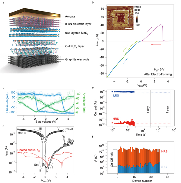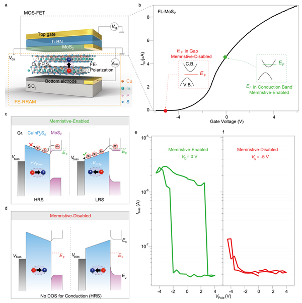图3 器件的可编程存储特性。a)器件结构示意图。b)MoS2层的转移特性曲线。c-d)异质结的能带结构图。e-f)通过施加门电压实现了对存储窗口从有到无的调控。