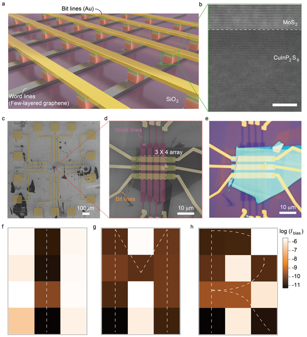 图2 铁电忆阻器存储阵列演示。a)二维铁电RAM结构示意图。b)CuInP2S6/MoS2界面的HAADF-STEM照片。c)3×4阵列的SEM图像。d)局部放大图。e)3×4阵列的光学照片。f-g)通过读取3×4阵列中每个交叉点的高阻态和低阻态编码的“I”、“M”和“R”的简化字母。