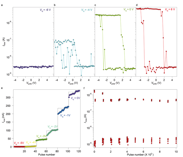 图4 门电压可编程存储器的多阻态存储特性。a-d)器件在不同门电压下的存储窗口。e)器件的多阻态存储性能演示。f)栅极调控的耐疲劳特性。