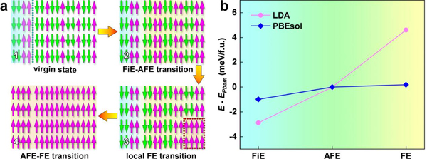 图1:反铁电-亚铁电-铁电相变过程示意图以及第一性原理计算结果。(a)相变过程示意图; (b)不同相的能量稳定性。