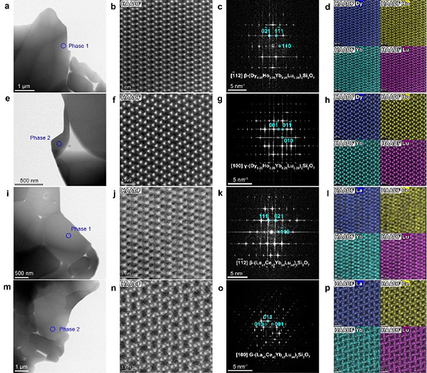 图1 (Dy0.25Ho0.25Yb0.25Lu0.25)2Si2O7和(Lax1Cex2Ybx3Lux4)2Si2O7(x1+x2+x3+x4=1)块体样品中多型相的STEM-HAADF图像。