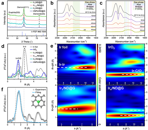 图1. 催化剂结构表征。a X射线衍射谱, b Ir1/ND@G的原位CO- DRIFTS, c Irn/ND@G的原位CO- DRIFTS, d EXAFS谱图, e WT分析, f Ir1@Gr模型示意图。