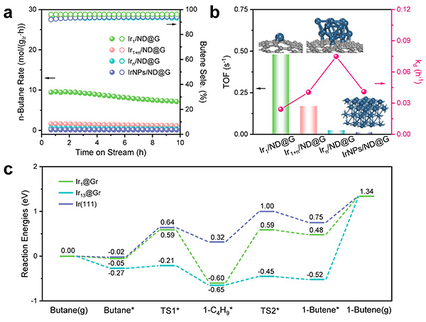 图2. a 催化剂丁烷脱氢催化活性, b 不同结构TOF与失活速率常数kd关系, c Ir1@Gr、Ir13@Gr和Ir(111)结构模型上丁烷脱氢能量变化曲线。