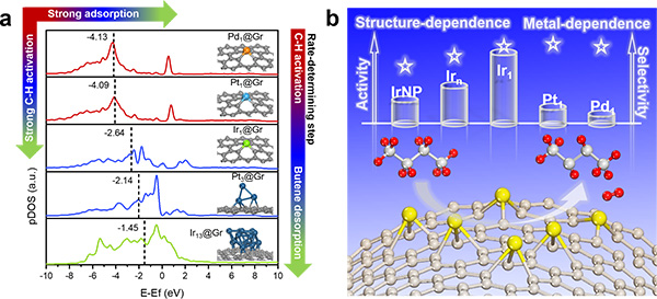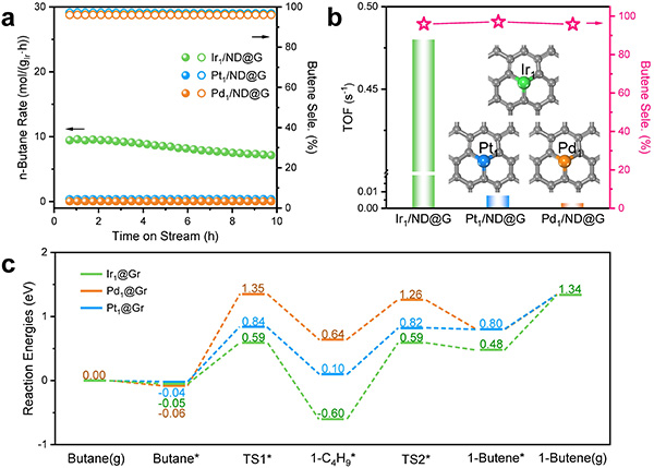 图3. a 催化剂丁烷脱氢催化活性, b不同金属组分TOF和丁烯选择性的关系, c Ir1@Gr、Pt1@Gr和Pd1@Gr结构模型上丁烷脱氢能量变化曲线。