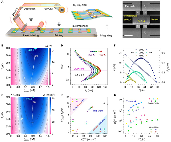 热电器件可基于热电效应对“热能”和“电能”双向转换,从而实现简单快速的热能回收和主动热管理,因此受到广泛应关注。针对功能快速拓展、功率不断提高的便携式电子设备(手机、平板电脑等),亟需利用柔性微型热电器件对其产生的热能进行有效回收与控制。但受限于柔性热电材料相较于块体材料的性能劣势和高精度微型器件集成的技术难度,目前柔性微型热电器件的研制一直是本研究领域的一个重要挑战。