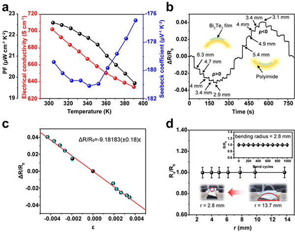 图1. 设计制备的Bi2Te3/PI薄膜热电、压阻及柔性性能测试结果。