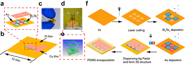 柔性温度-压力双参数传感器广泛应用于人体健康监测和智能机器人传感等领域,因而受到了广泛关注。然而,目前柔性温度-压力传感器基本都采用两种独立的传感材料实现双参数传感功能,这不仅提高了传感器的设计-集成难度,也增加了制造成本。因此,研发具有多功能一体化的先进传感材料成为本领域的研究重点和难点问题。碲化铋是一种能将热能直接转换为电能的半导体材料,其产生的电压与施加在材料两端的温差成正比关系,可用于温度传感;同时,该类材料在受到应力作用时,带隙会发生明显改变,表现出压阻效应,从而还可以实现压力传感。但碲化铋半导体具有本征的刚性和脆性,力学和加工性能较差,难以弯曲变形、精密加工和高密度集成器件。