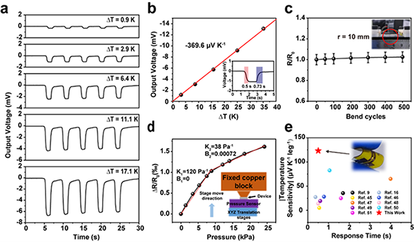 图3. 传感器温度-压力传感性能及柔性性能测试。