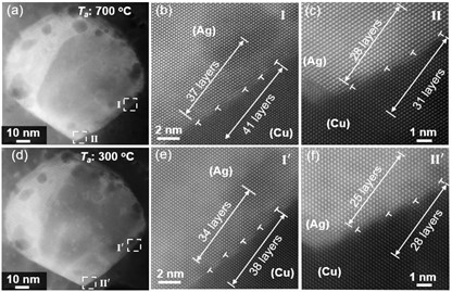 图3 退火调节Cu/Ag界面的准原位观察。Cu/Ag合金在(a-c)700 ℃退火后和(d-e)300 ℃退火后界面的HR-STEM图像。