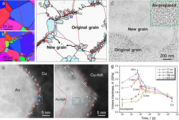图1仿调幅分解结构Cu/Au合金在退火条件下的界面结构演化和强度变化。(a)制备态和(b)退火初期Cu/Au合金样品的EBSD图像。(c)图为(b)图的结构示意图。(d)退火初期新相形核生长前沿的SEM照片;(e)制备态和(f)退火态样品界面的HR-STEM照片;(g)不同结构尺寸Cu/Au合金的显微硬度随退火时间的变化。退火温度为450 ℃。