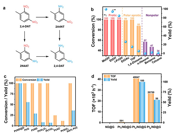 图2 催化剂性能测试。a 2,4-DNT加氢路径,b 反应溶剂考察,c 不同载体性能对比,d 不同结构Pt催化剂TOF和催化性能的关系。