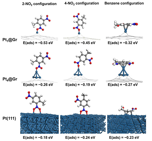 图3 DFT计算。2,4-DNT在Pt1@Gr、Pt4@Gr和Pt(111)上三种可能的吸附模式(2-NO2-构型、4-NO2-构型和benzene-构型)以及对应的吸附能。